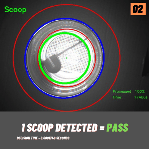 Automate-X has developed a powerful object detection vision system to identify the presence of a scoop inside a metal can.