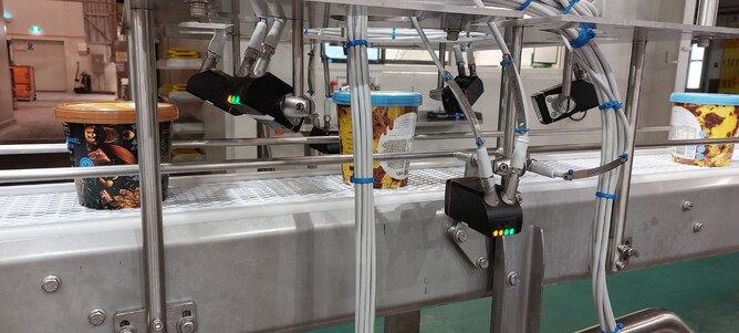 To achieve this, an array of 6 barcode scanners are installed on the conveyor and hanging from the top is a smart camera that will detect the artwork on the ice cream lid. These are assembled in a compartment to prevent ambient light from showing light on the tub.